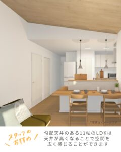 - ご夫婦憧れの吹き抜け代わりに「勾配天井リビング」で解放感 ! 平屋だからこそできる、天井を高くすることで縦の広がりを演出。広々としたリビング空間を実現しました。明るく開放的なメインスペースです!